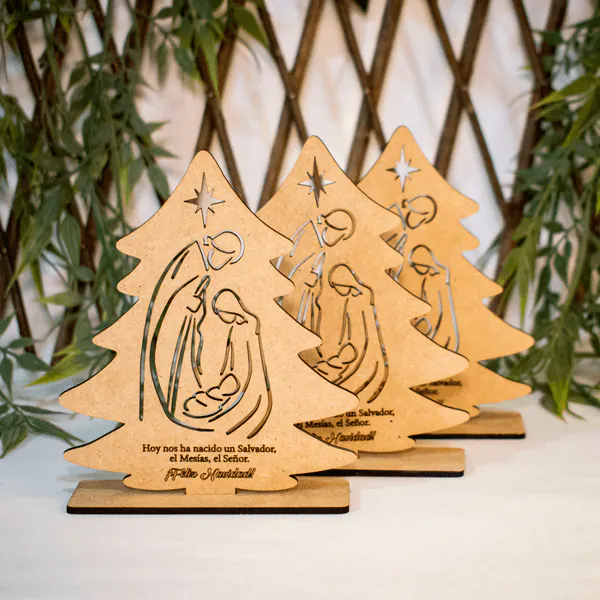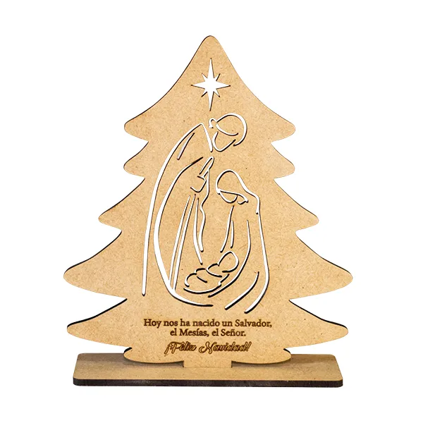 Adorno decorativo Árbol de Navidad Pesebre en madera MDF de 12 cm de alto, 10 cm de largo y 3 cm de ancho. Representa la Sagrada Familia con el niño Jesús, María, José y la estrella de Belén, grabado en diseño minimalista con láser. Ideal para mesas y repisas, su base es estable y ligera. Fabricado bajo pedido con posibilidad de personalización, perfecto como decoración navideña o regalo único. El acabado natural rústico aporta calidez y elegancia, siendo un símbolo significativo del espíritu navideño que destaca en cualquier espacio. Adorno Árbol de Navidad Pesebre en MDF - Elegancia y significado para tu decoración navideña. Personalizable y hecho a mano bajo pedido.