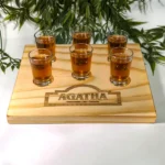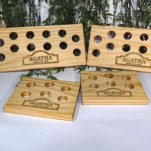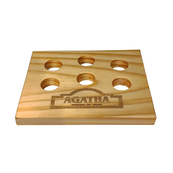 Base para shots en madera de pino con grabado láser y acabado natural protegido. Ideal para servir bebidas en bares y eventos.
