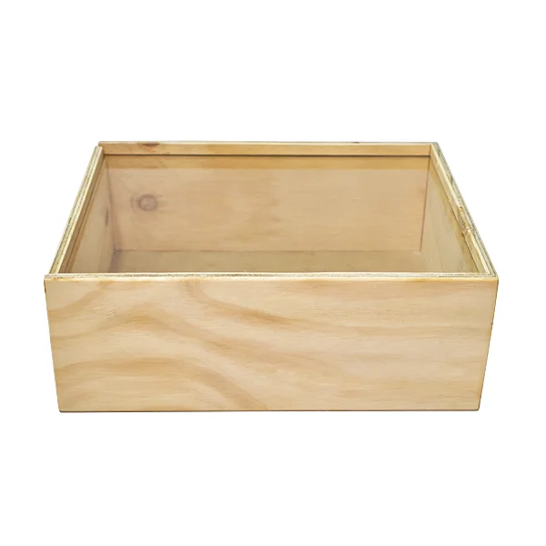 Caja en madera con tapa acrílica deslizable, ideal para exhibir y organizar productos con fácil acceso.