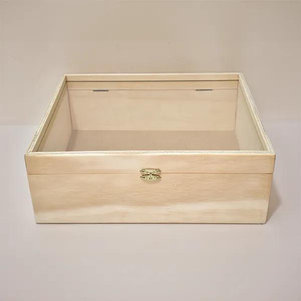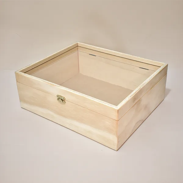 caja de madera en triplex de pino con tapa acrilica transparente abierta vista 3/4
