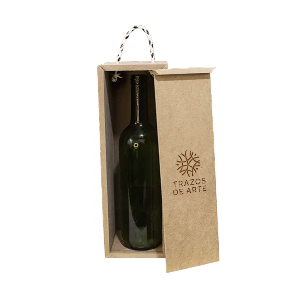 nte para presentar una botella de vino de forma organizada y protegida. Su diseño vertical permite acomodar la botella de manera segura, aportando una presentación limpia y adecuada para diferentes ocasiones.