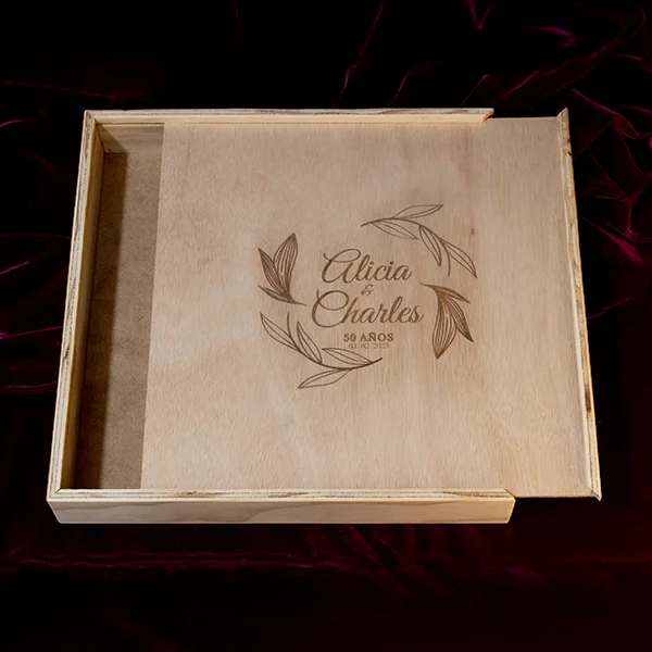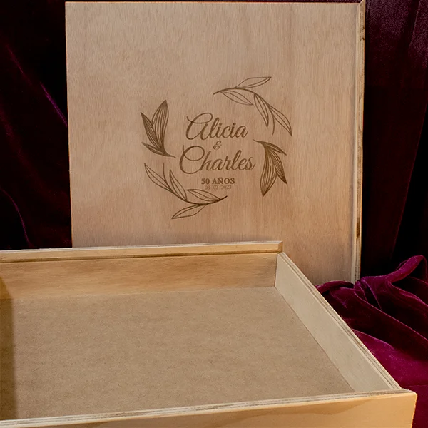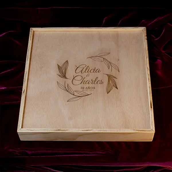 Caja en triplex de okume tapa deslizable personalizada de 30 x 30 x 6 cm y tapa deslizable en triplex de okume para personalizar con grabado o impresión con el mensaje que tú quieras.