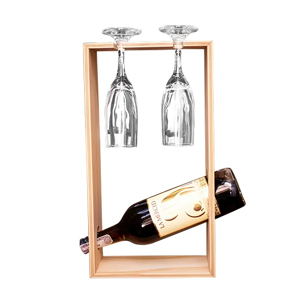Su diseño permite acomodar el vino en diagonal, optimizando el espacio interior y aportando una presentación elegante. Además, incorpora un área superior para colgar dos copas, manteniéndolas seguras y listas para su uso. Esta base para vino en madera no incluye copas ni licor, lo que permite personalizar el contenido según la ocasión.