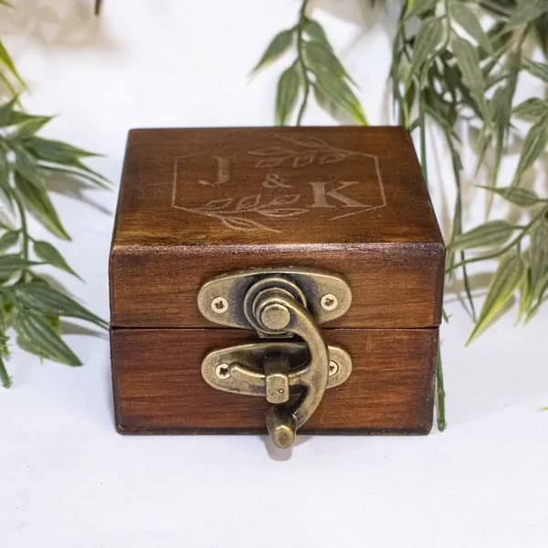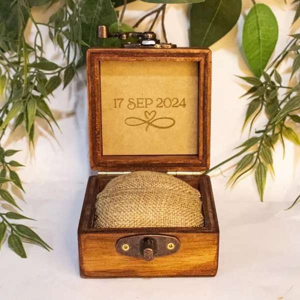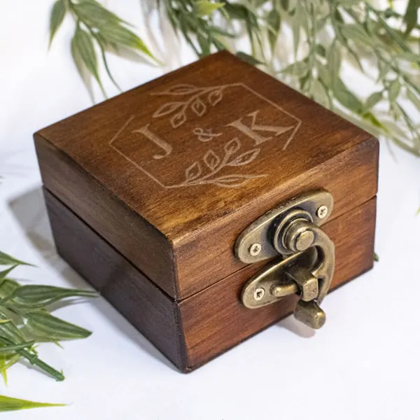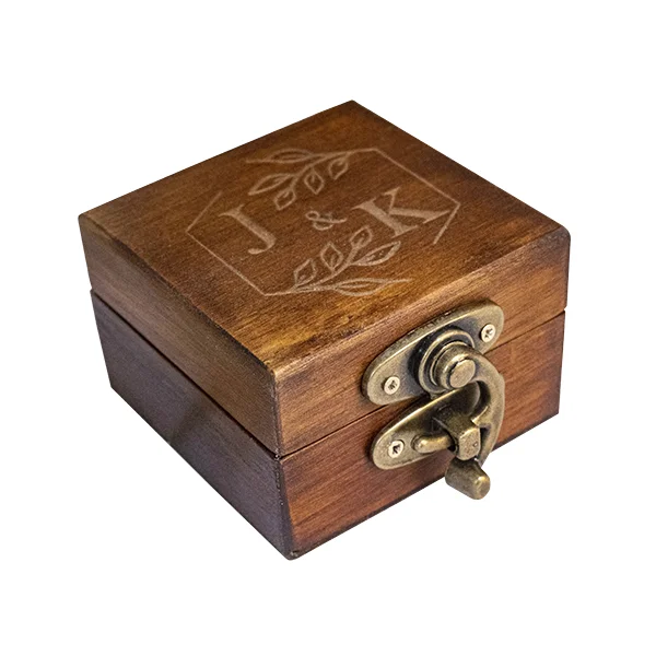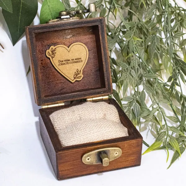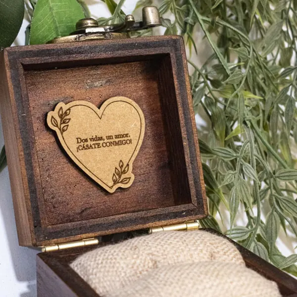 La Caja para anillo en madera envejecida es un accesorio decorativo y funcional, ideal para resguardar anillos en ocasiones especiales. Fabricada en madera de pino de alta calidad con un acabado rústico, incluye una almohadilla de yute y algodón para proteger el anillo. Personalizable mediante grabado láser, esta caja es perfecta tanto para eventos personales como bodas y aniversarios. El cierre metálico garantiza seguridad, mientras que el diseño compacto y la opción de elegir el color del acabado hacen de esta caja una pieza versátil y elegante, fabricada artesanalmente bajo pedido.