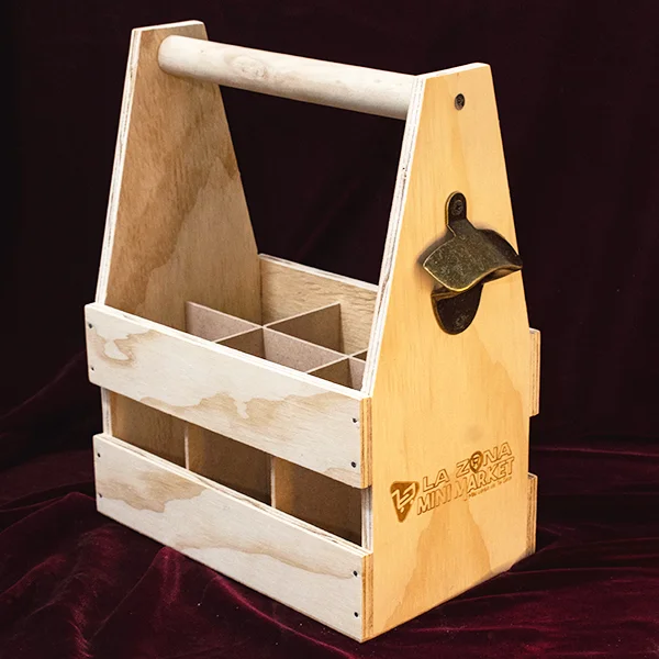 Caja para cerveza six pack en triplex de pino con destapador metálico, acabado natural y grabado láser personalizado.