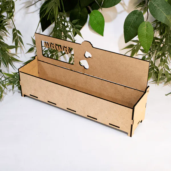 Está fabricada en MDF de 3 mm cortado a láser, lo que permite un ensamble preciso y un acabado limpio en cada una de sus piezas. Su tapa incorpora un sistema tipo bisagra que facilita la apertura y cierre, manteniendo el contenido protegido. Además, puede personalizarse mediante grabado láser con nombres, frases o dedicatorias según la ocasión.