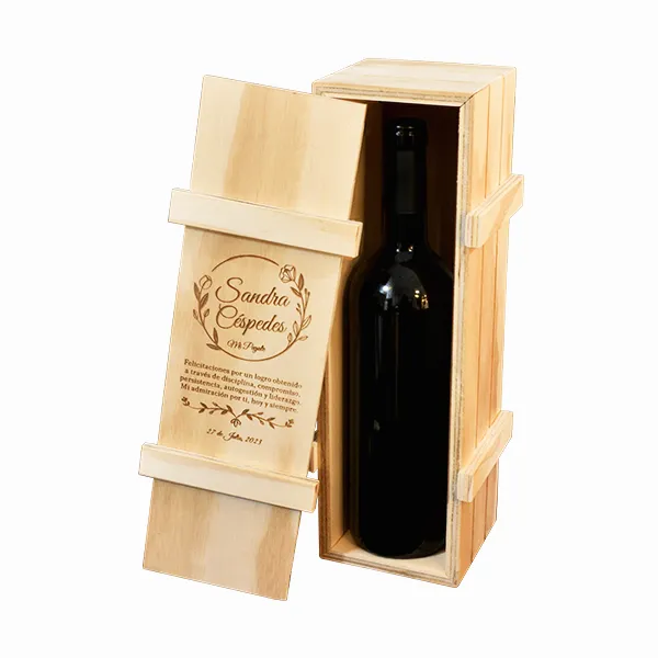 La caja para vino en madera está diseñada como un estuche práctico para almacenar y presentar botellas de 750 ml de forma segura. Su estructura permite mantener la botella protegida durante el transporte y mejorar su presentación como regalo.