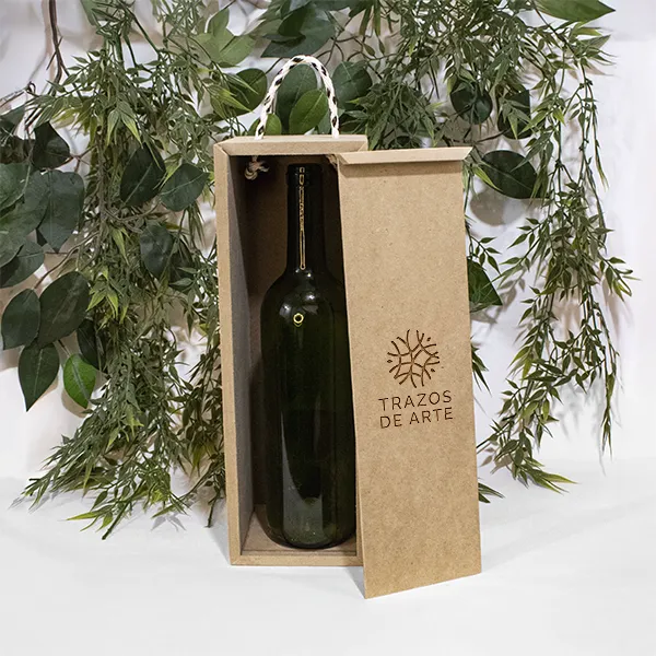 Caja para vino en MDF con tapa deslizable y grabado láser. Diseñada para botella de hasta 31 cm de alto. Presentación práctica y personalizada.