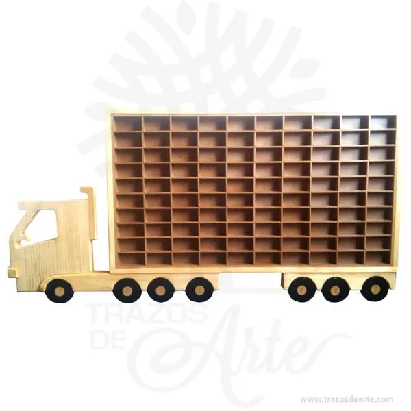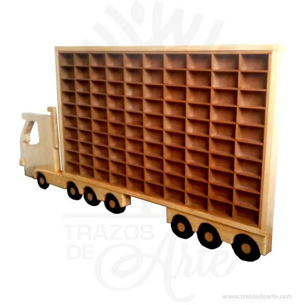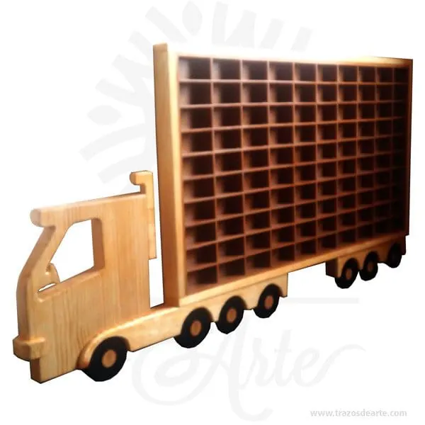 Hermoso y decorativo camión repisa para 100 carros, perfecto mostrador para colecciones, hecho en madera con incrustaciones tipo intarsia.