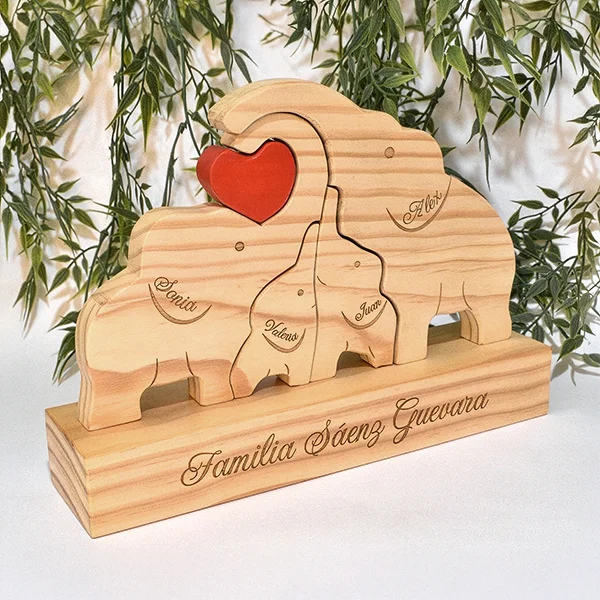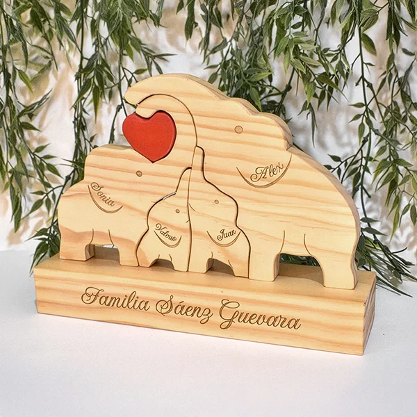 Escultura Familiar de 4 Elefantes en madera de pino, personalizada con grabado láser y base incluida con un tamaño de 4 cm de ancho x 25 cm de largo x 25 cm de alto. Ideal para decorar el hogar y representar unión y protección familiar. Un detalle significativo para regalar o conservar como símbolo especial.