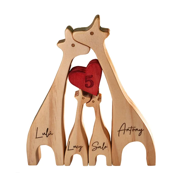 La personalización se realiza mediante grabado láser sobre cada jirafa, permitiendo incluir nombres de los integrantes de la familia con un acabado preciso y permanente sobre la superficie de la madera.