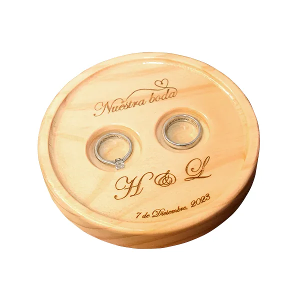 Porta anillos de boda en madera de pino con grabado láser personalizado de 12 cm de diámetro. Diseño elegante y natural ideal para ceremonias civiles o religiosas. Perfecto para bodas rústicas o modernas. Se puede personalizar en grabado láser con el nombre, fecha, frase o logo que desees. ¡Haz que tu momento sea inolvidable!
