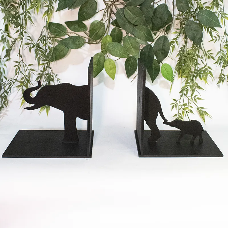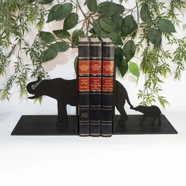 Juego de 2 cuñas decorativas de elefantes en madera MDF para soporte de libros (40x15x16 cm).