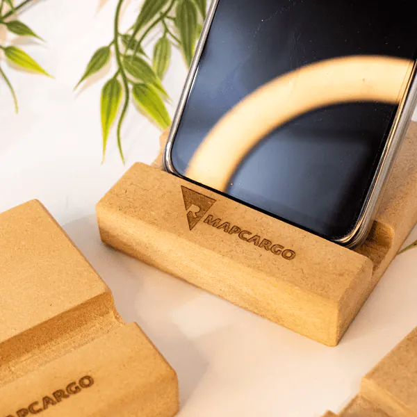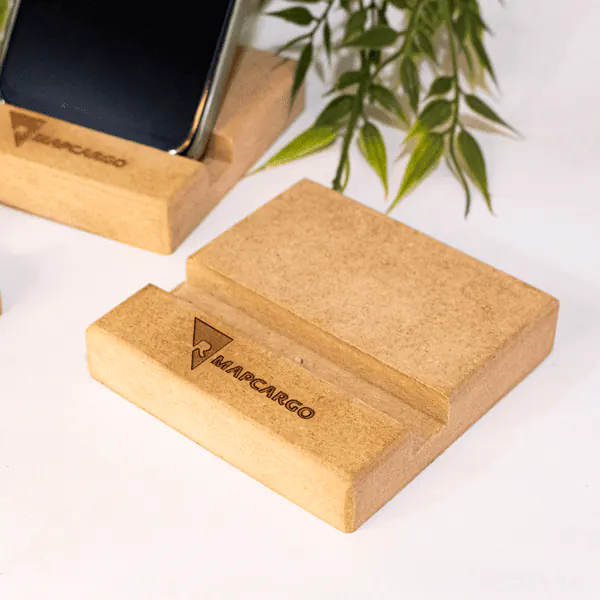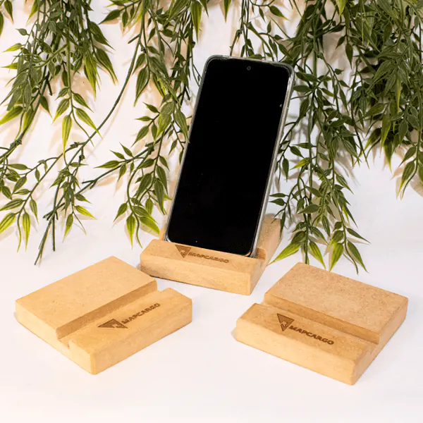 Base estable para smartphone en MDF de alta densidad, personalizable con grabado láser para oficina y hogar.
